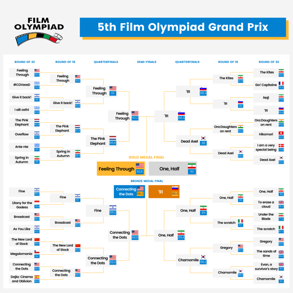 32 of them qualified to the knock – out stage. With only 5 knock-out wins, a film, becomes the Film Olympiad Grand Prix Gold Medalist.